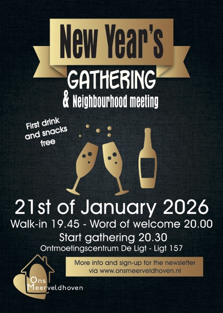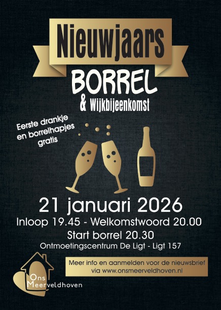 Wijkplatform Meerveldhoven knalt 2026 binnen met een nieuwjaarsbijeenkomst en -borrel. Op 21 januari zijn alle wijkbewoners welkom in Ontmoetingscentrum De Ligt. De bijeenkomst start om 20 uur met een welkomstwoord, met onder meer aandacht voor de activiteitenplanning van Wijkplatform Meerveldhoven in 2026.